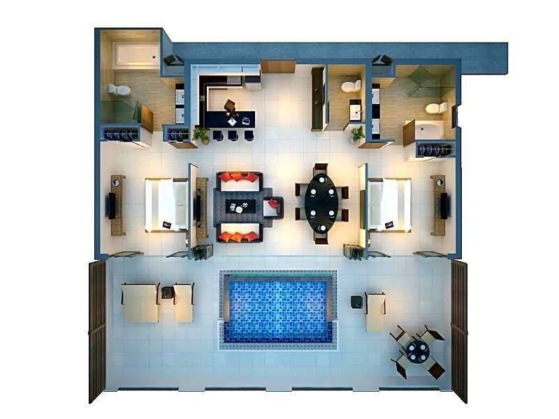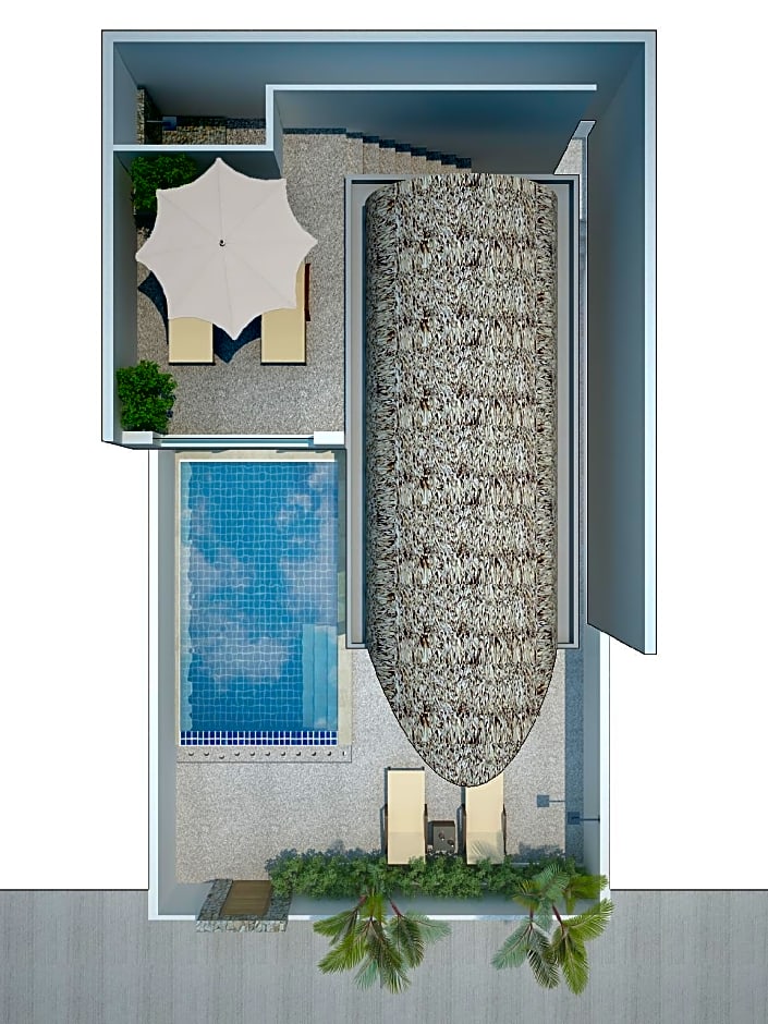 TWO BEDROOM MODERN POOL VILLA is 2099 square feet and includes a king-size bed 150-183 width plus living room, terrace, and ironing set.
