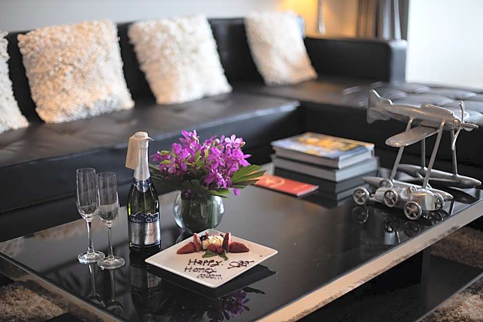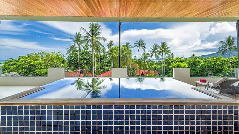 This spacious contemporary-designed space includes a balcony with a private infinity edge pool and separate sun deck. It has a spacious living room, fully-equipped kitchen with modern appliances and a dining area. Guests enjoy sweeping views of the picturesque Lamai Bay.
